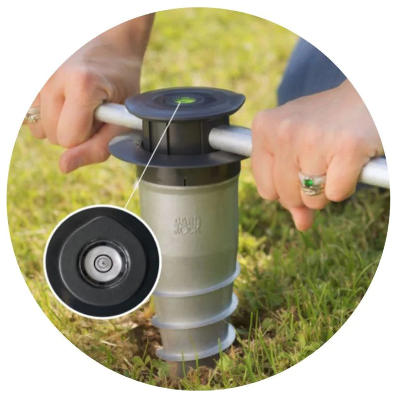 Schroef de verankeringsvoet rechtstreeks in de grond (gazon, bloembed, aarde, gestabiliseerde grond, enz.) met behulp van de schroefstang. De ingebouwde waterpas zorgt voor een nauwkeurige verticale bevestiging op vlakke grond en zelfs op hellingen! Eenmaal geplaatst, staat je materiaal perfect recht. Indien nodig, afhankelijk van de stabiliteit van je vloer, kan de bevestigingsvoet ook worden gebruikt om in beton te zetten. De procedure wordt beschreven in de instructies.